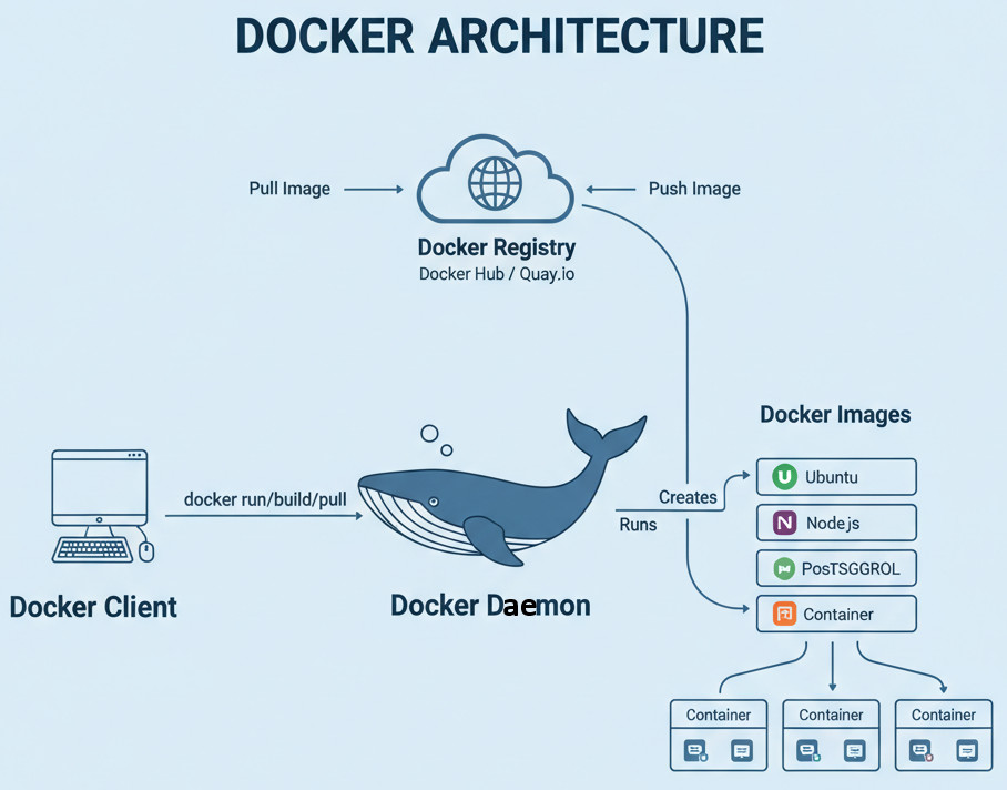 - Docker Client (Docker CLI): A command-line tool you use to talk to the Docker daemon (for instance, typing docker run nginx).